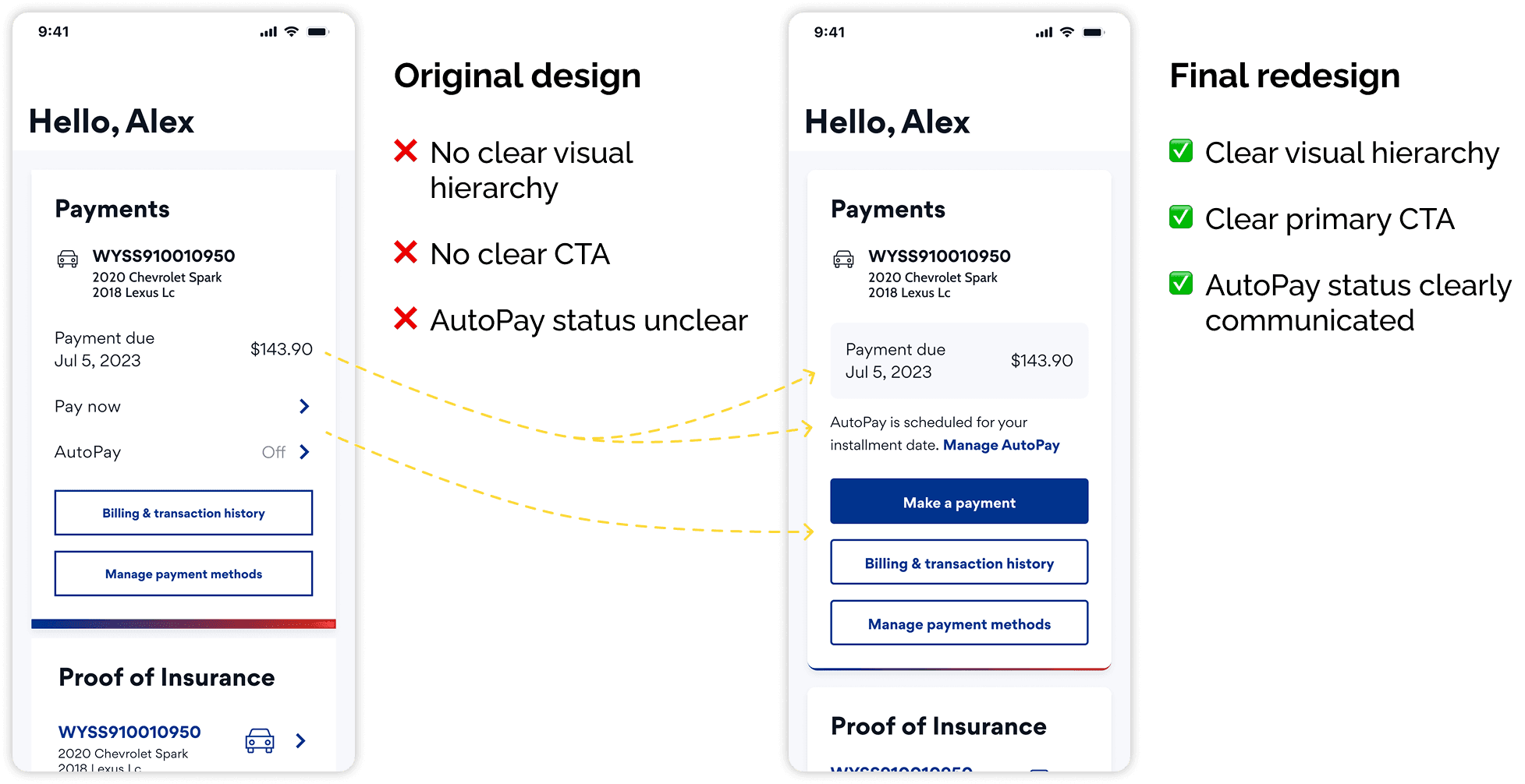 The final design introduced a clear AutoPay status message and improved information hierarchy and readability while not discouraged users from making a payment.