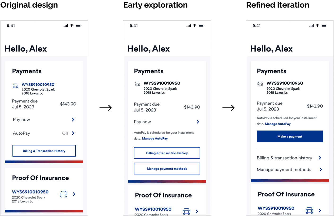 My first explorations struggled with visual hierarchy - the AutoPay messages were either too subtle or too distant from the payment info.