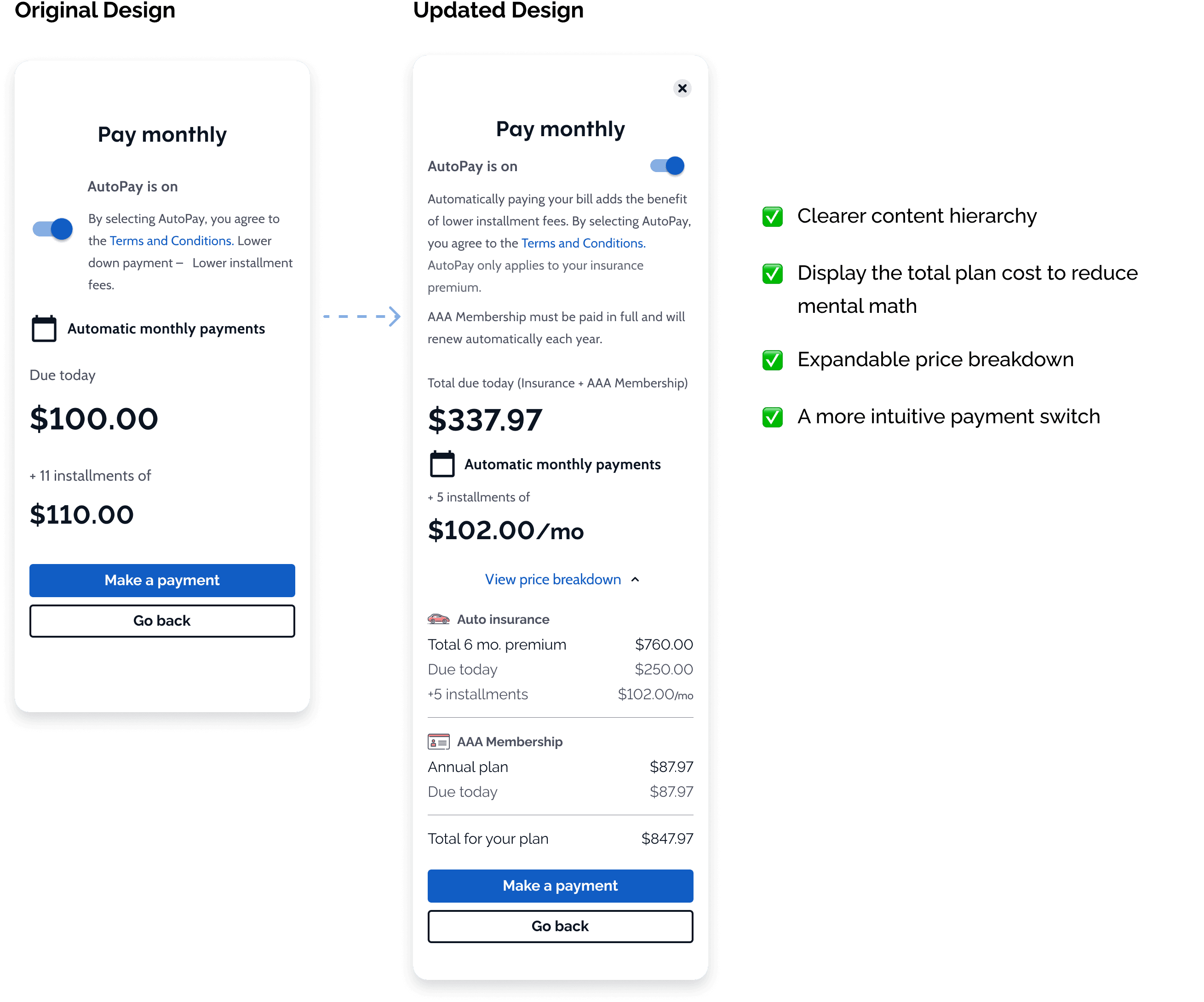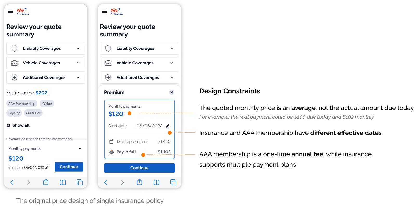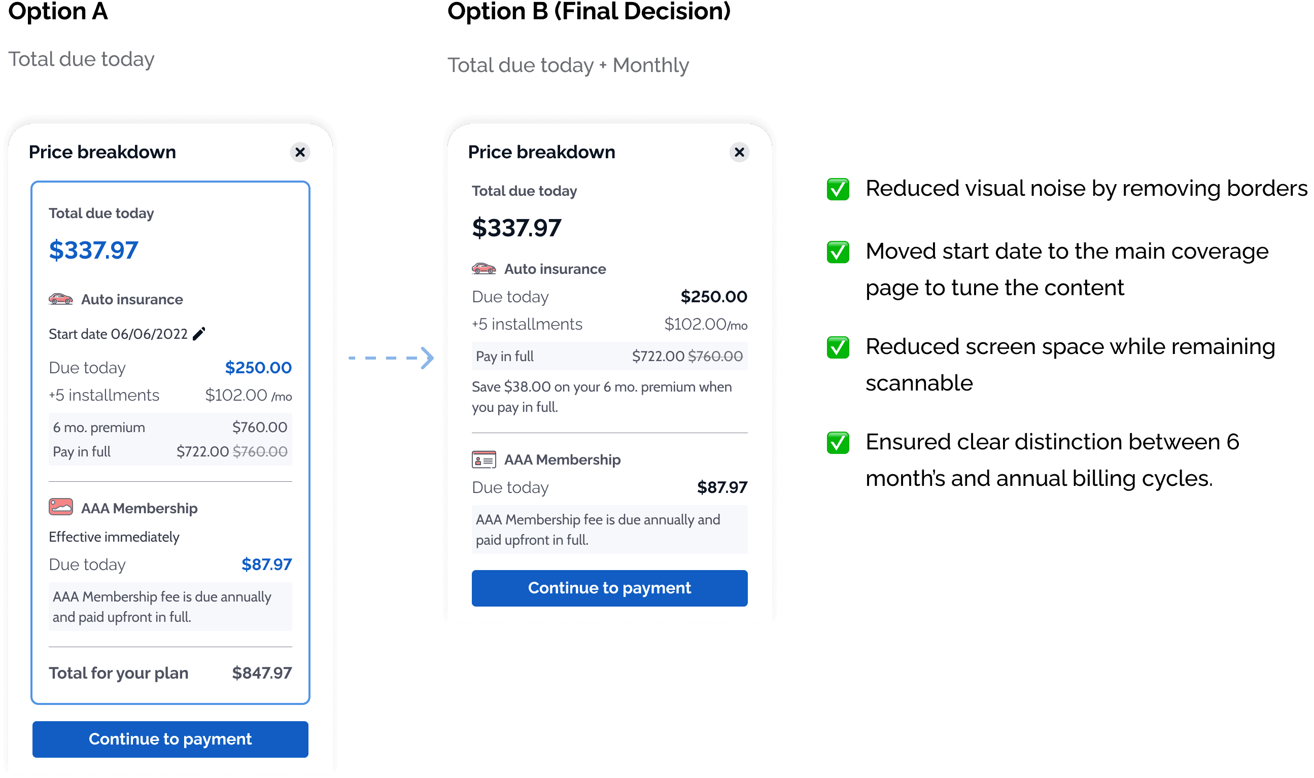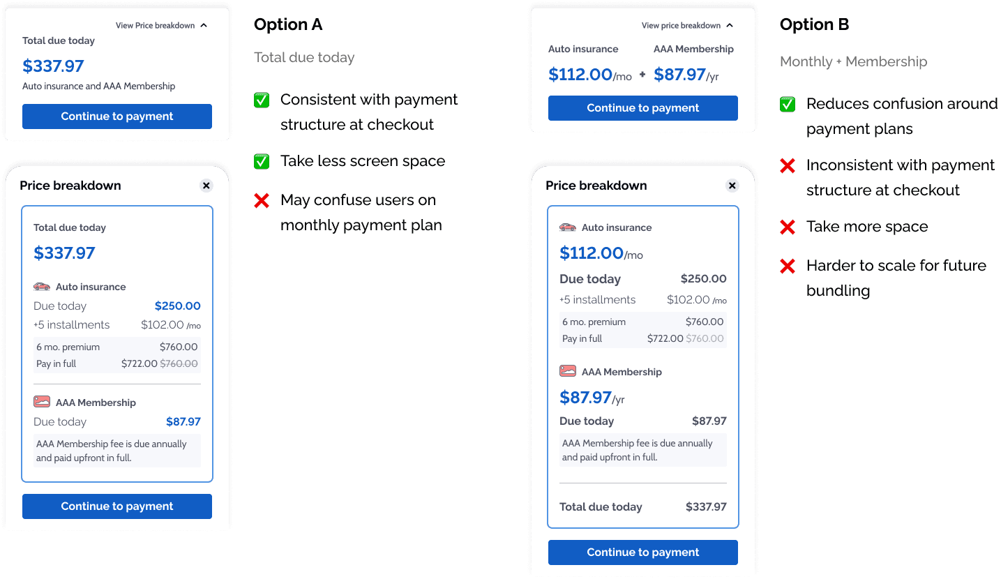 Insurance and AAA membership have different billing rules, start dates, and payment plans — but they needed to feel like one coherent purchase without misleading users.
